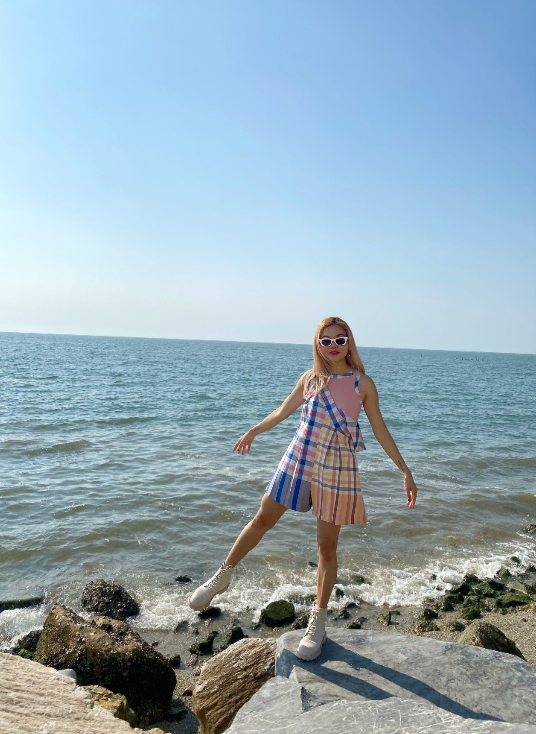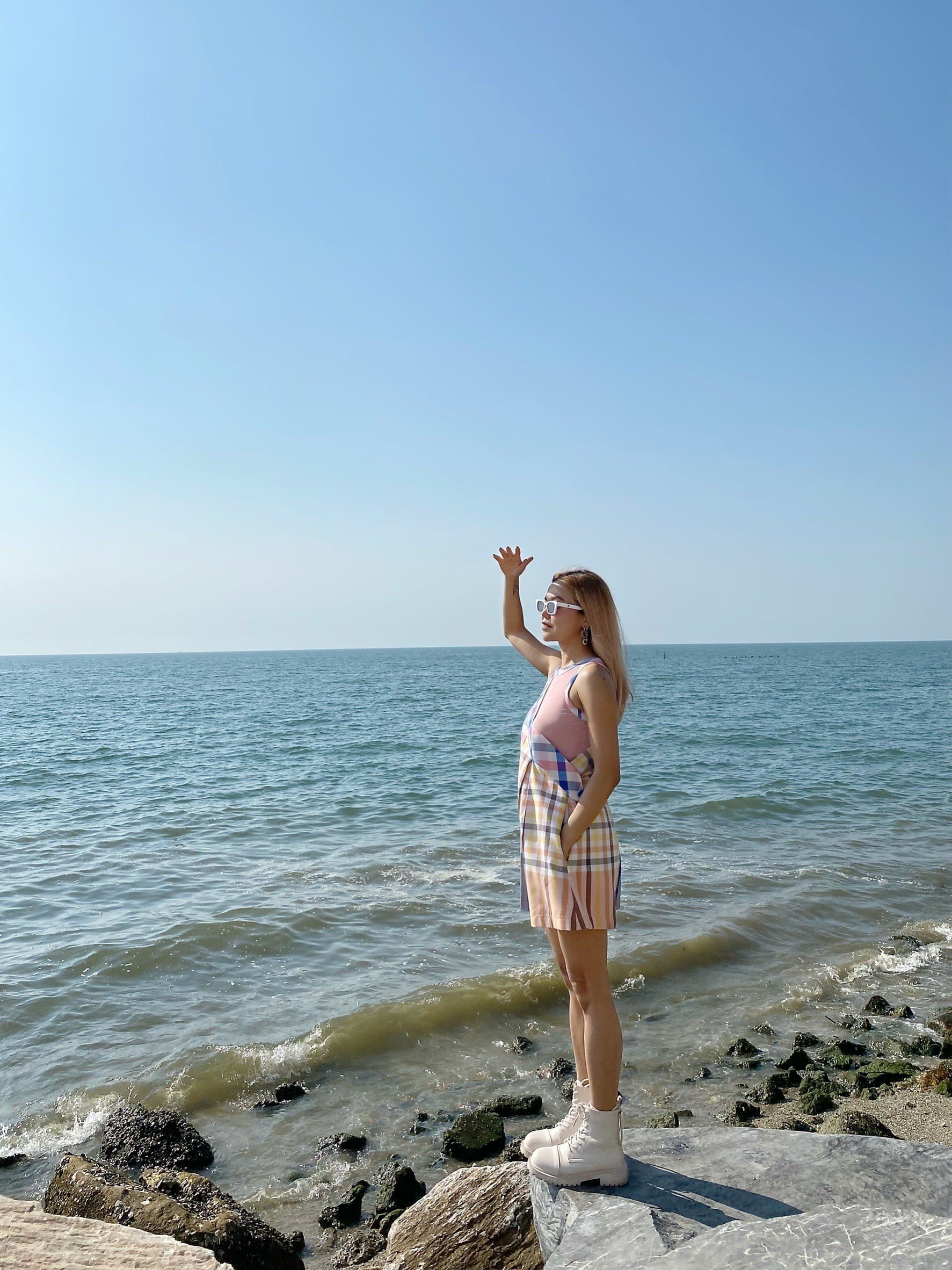 สวมเอี๊ยมผ้าขาวม้าขาสั้นน่ารัก มาบางแสนบางใจ เก๋ๆ