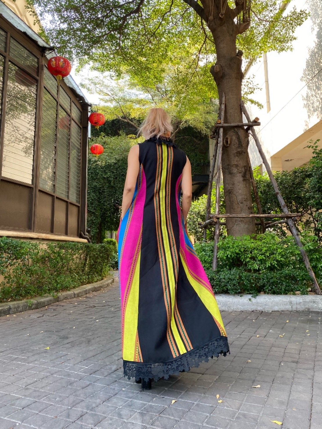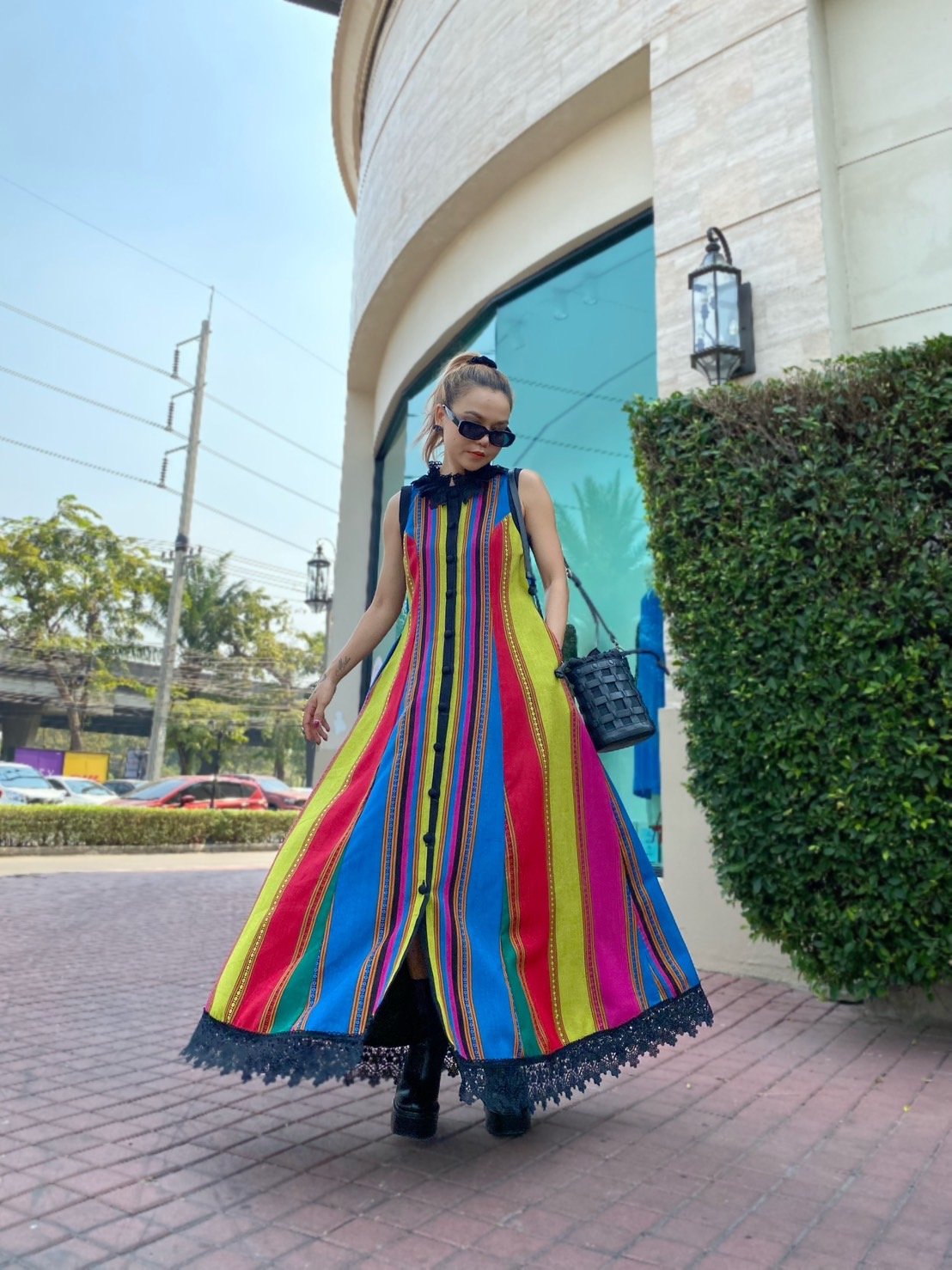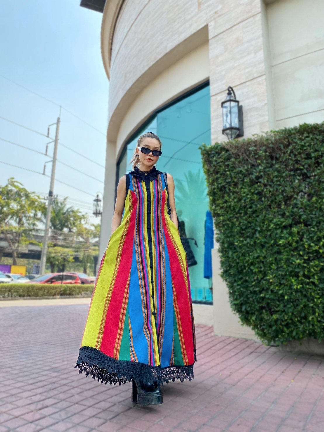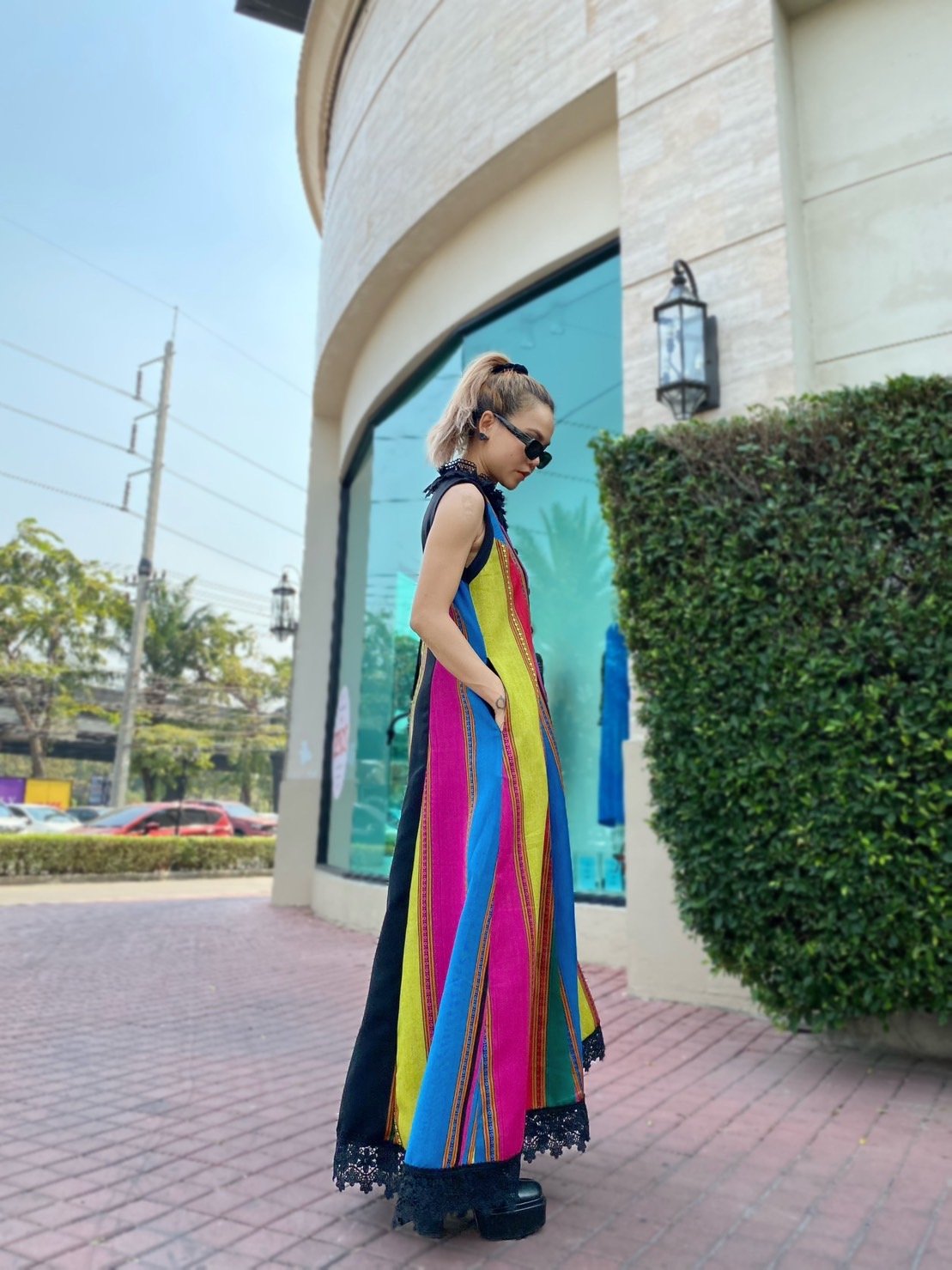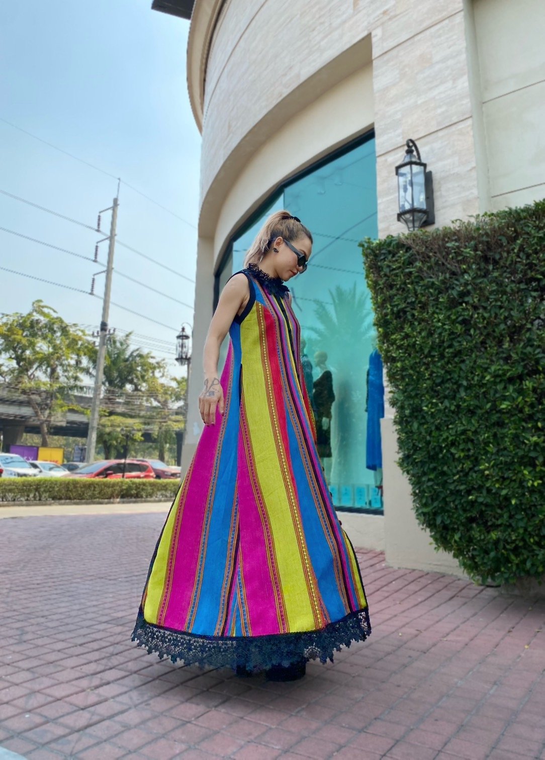 Maxi dress จาก ผ้าซิ่นลายรุ้งยกดอกแซม ของดี จ.ลำพูน