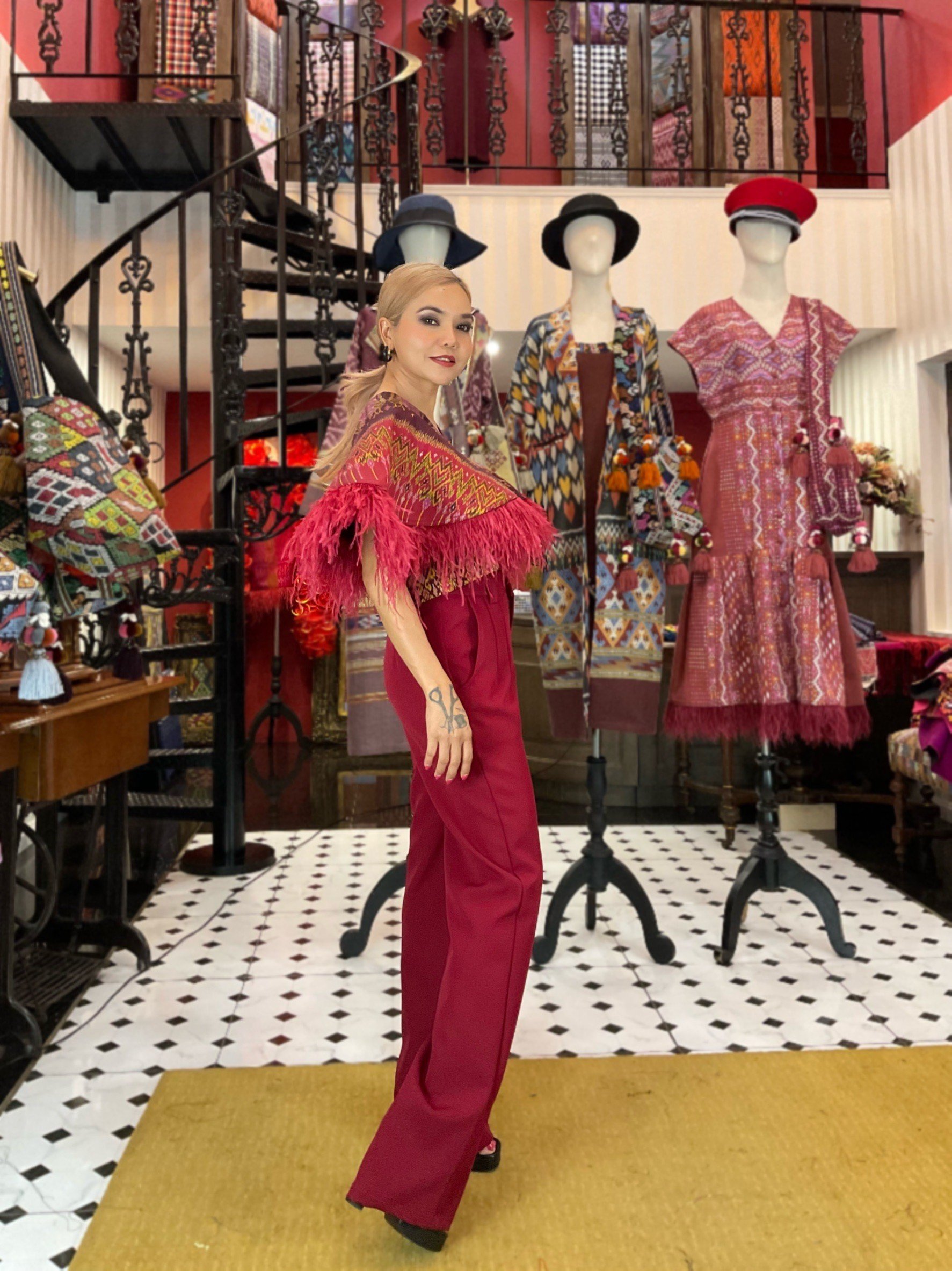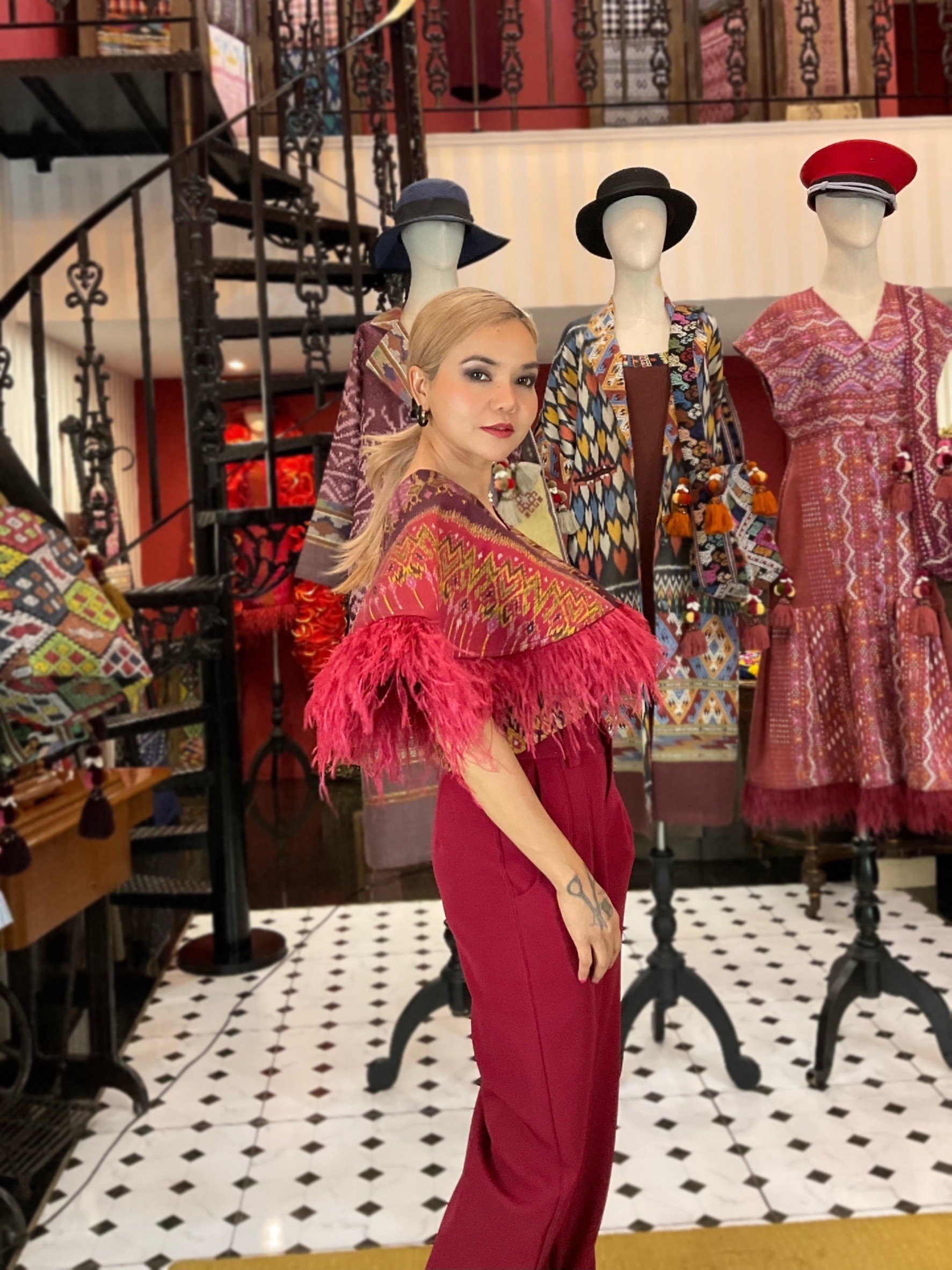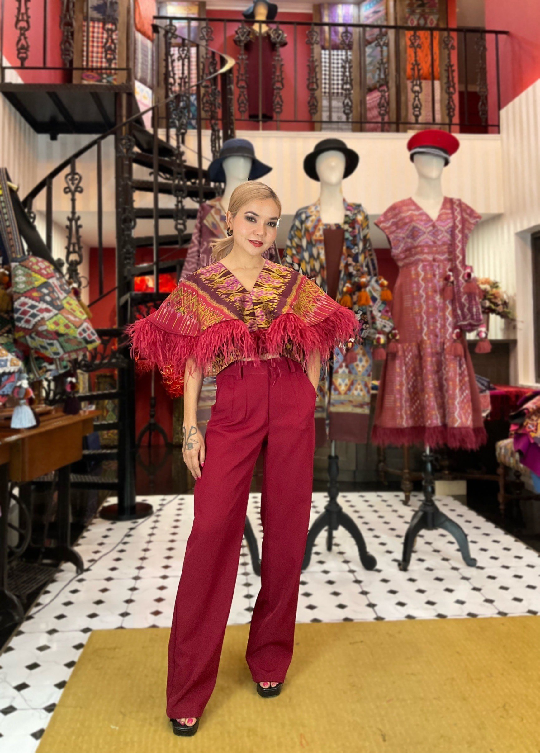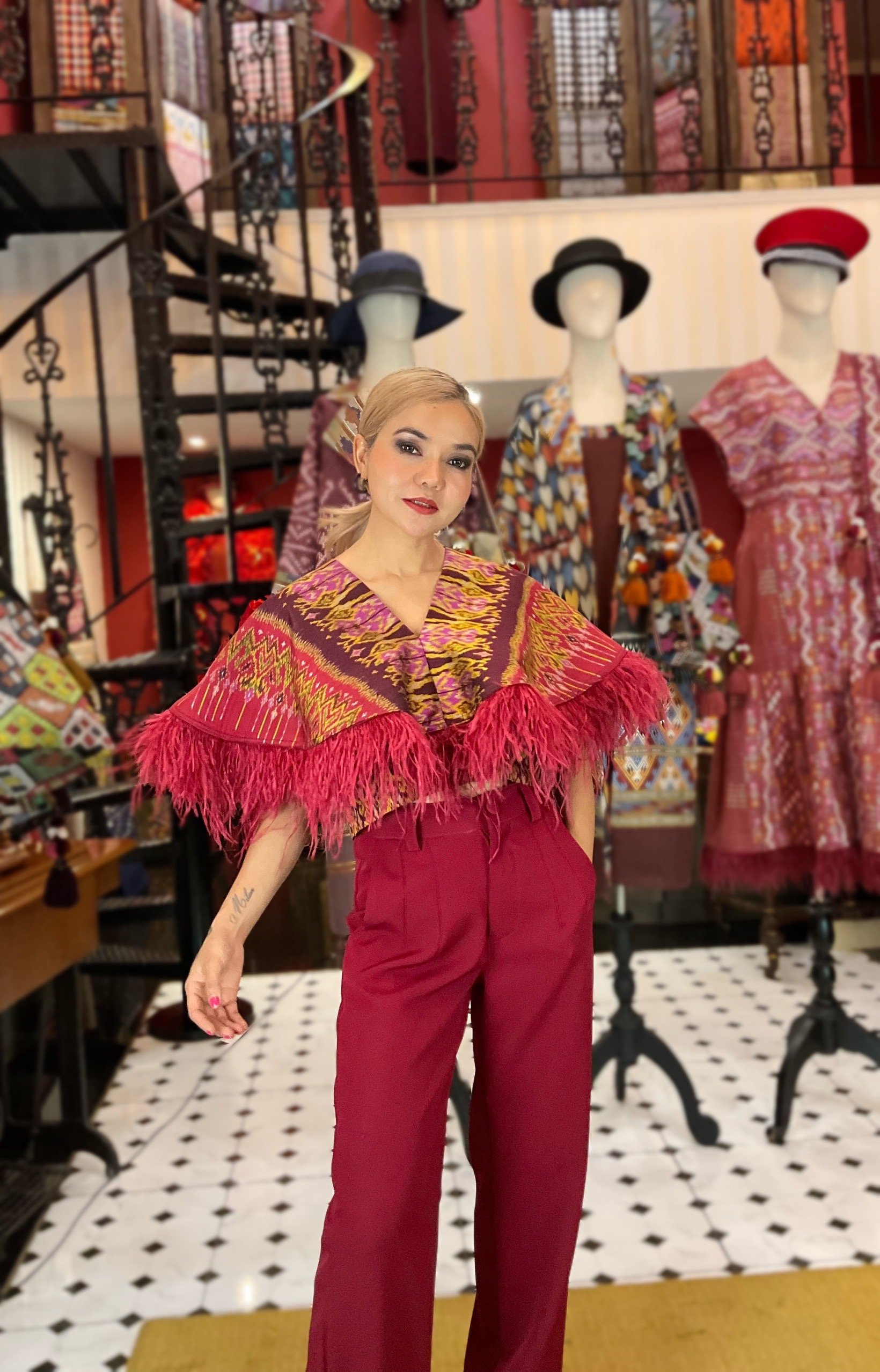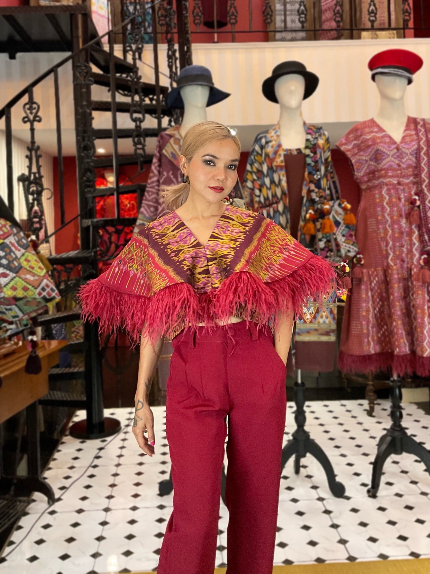 Crop top จากผ้าไหมทอมือ ของดี อ.ชนบท จ.ขอนแก่น แต่งด้วยขนนก
