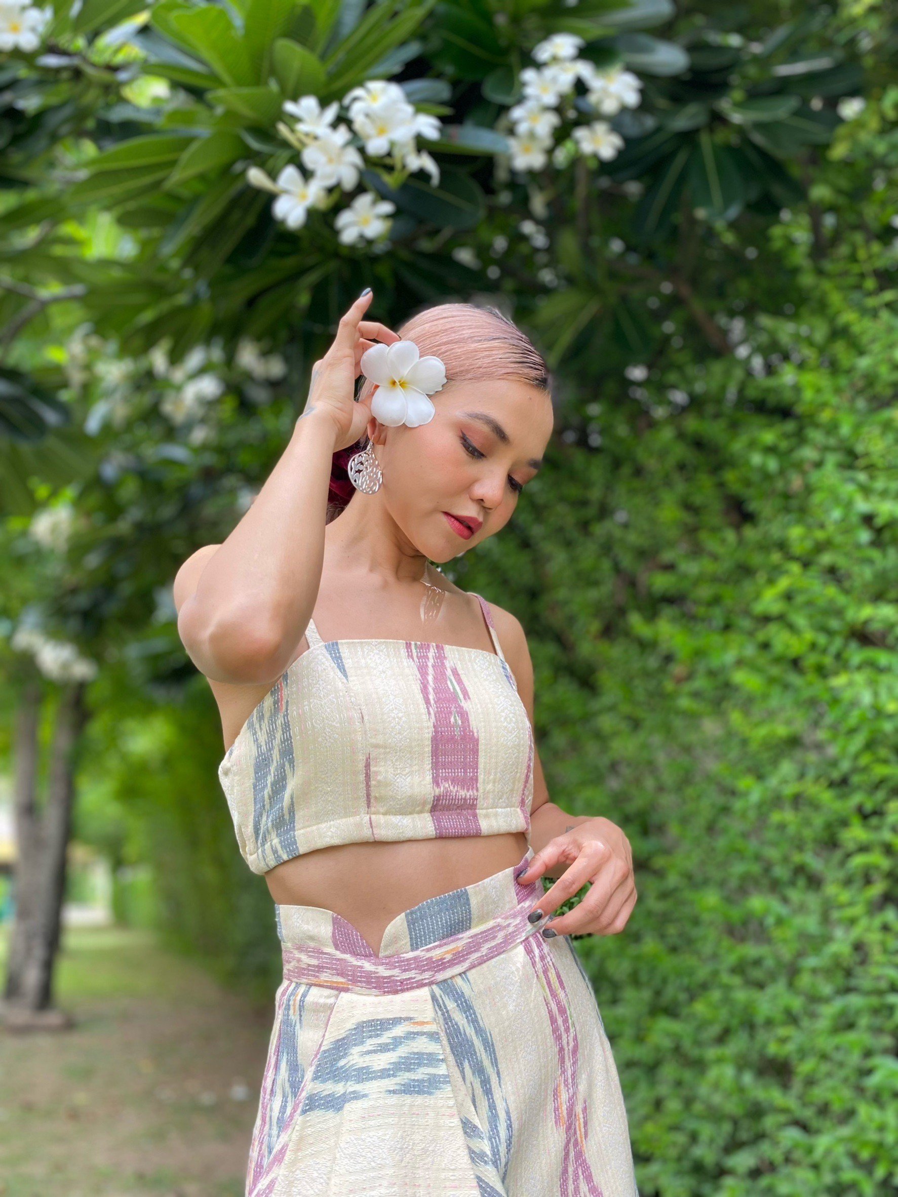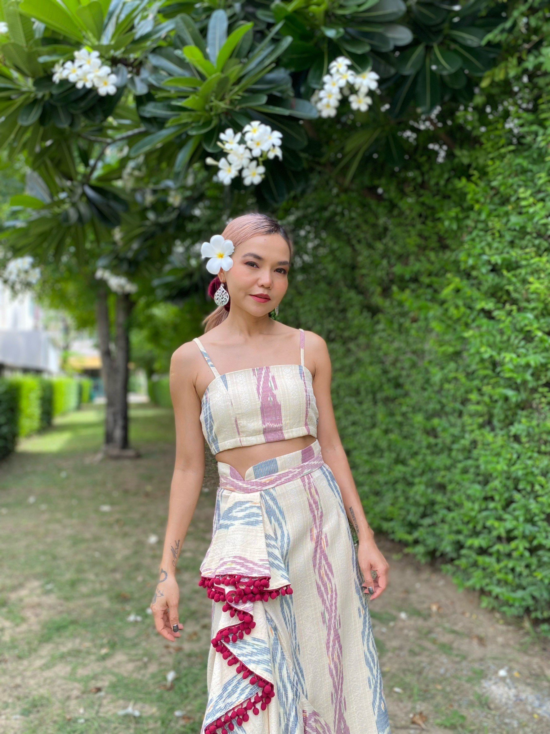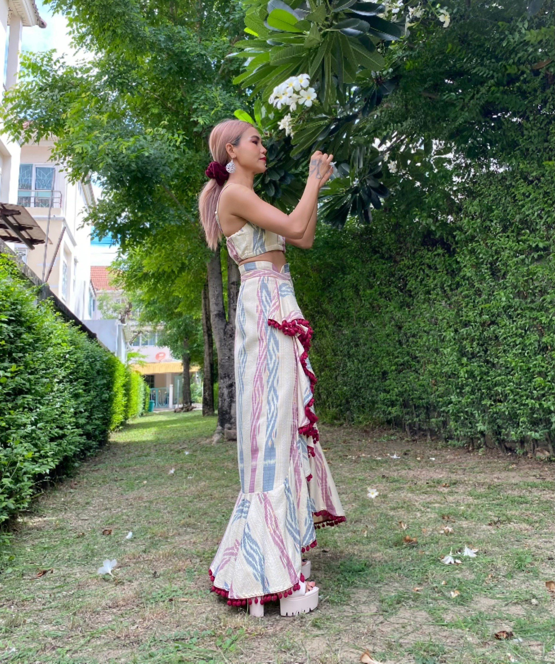 สื้อยืดคอจับจีบเฉียง มิกซ์แอนด์แมทช์ กับกางเกงจากผ้ามัดหมี่ ของดี จ.ลพบุรี