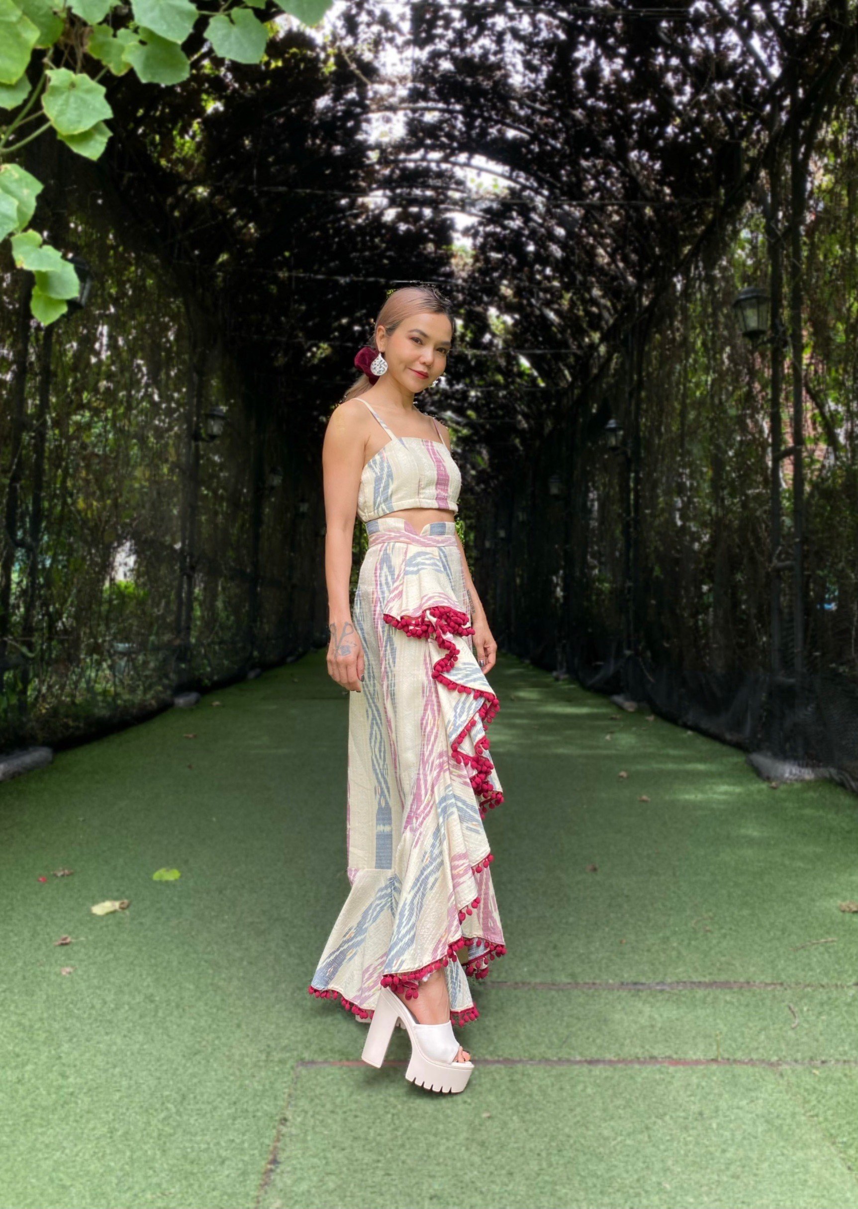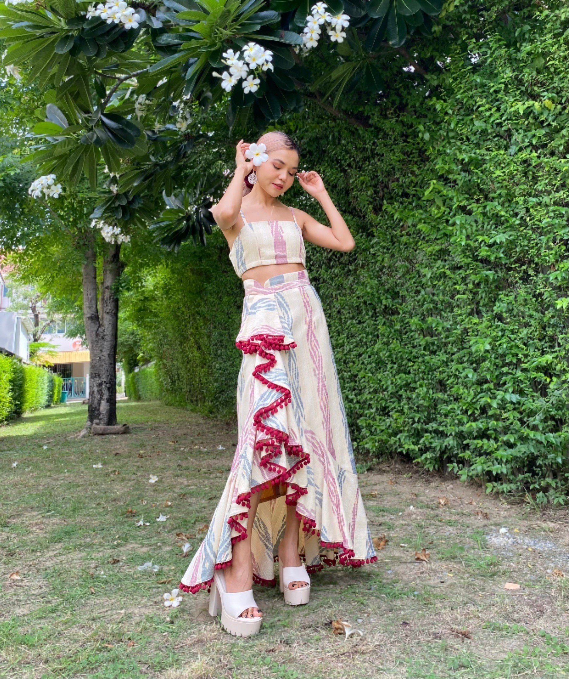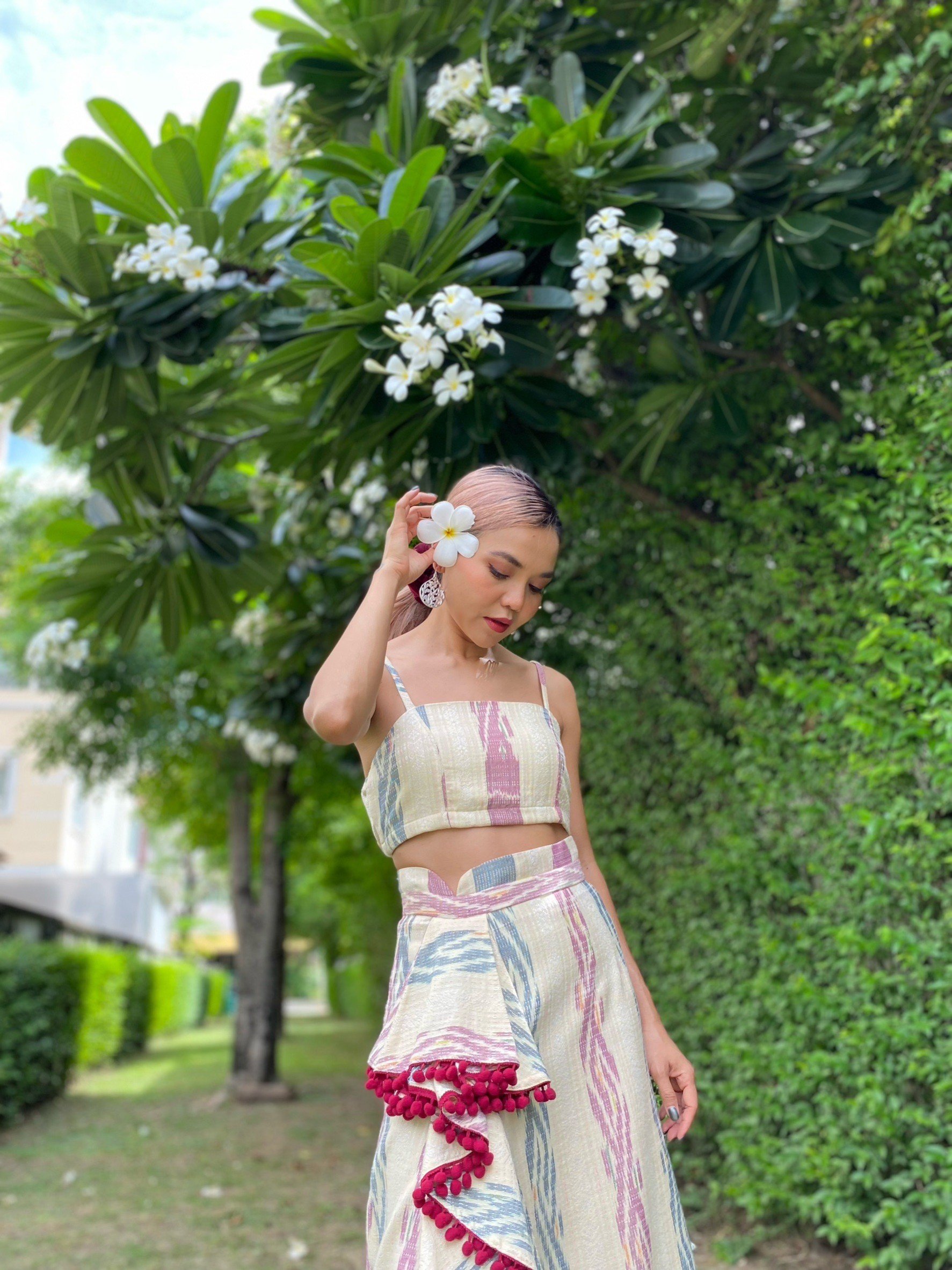 สื้อยืดคอจับจีบเฉียง มิกซ์แอนด์แมทช์ กับกางเกงจากผ้ามัดหมี่ ของดี จ.ลพบุรี