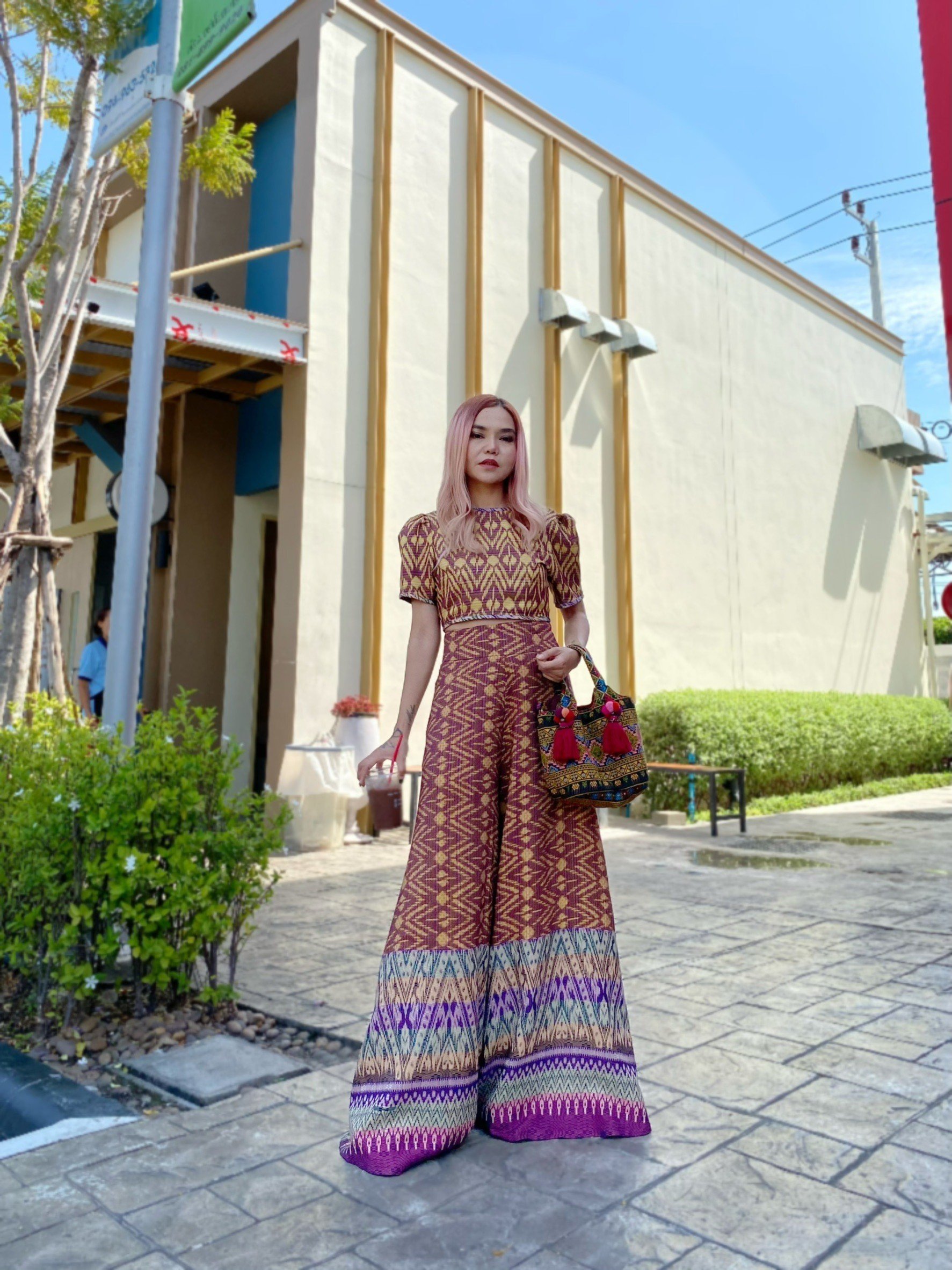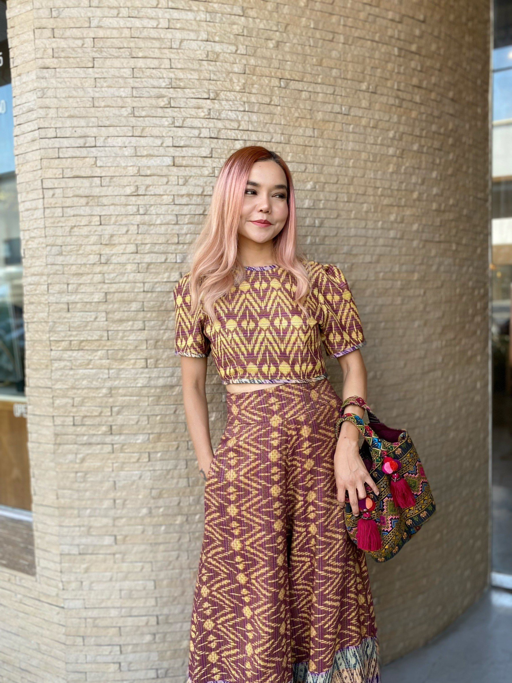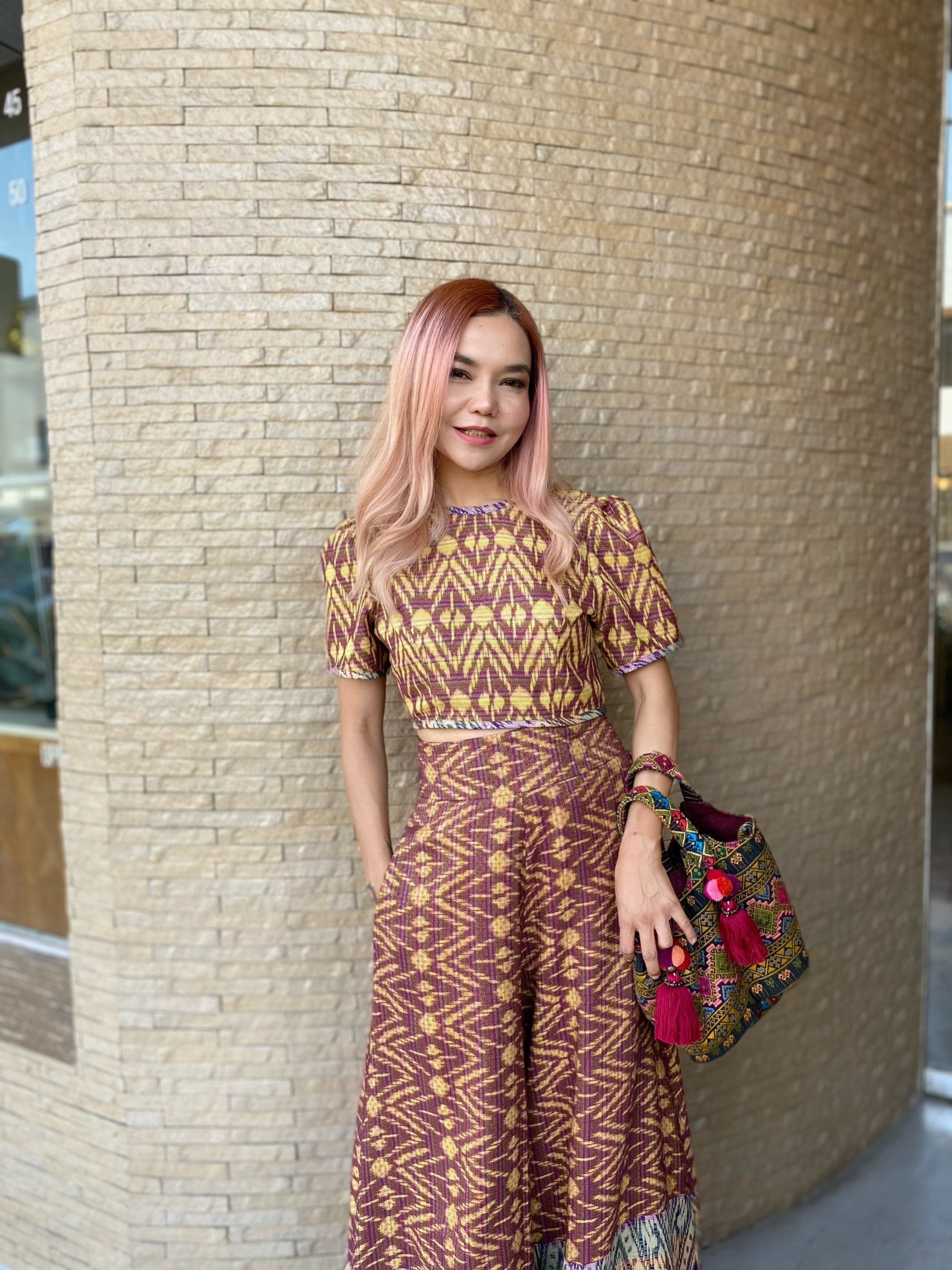 สื้อยืดคอจับจีบเฉียง มิกซ์แอนด์แมทช์ กับกางเกงจากผ้ามัดหมี่ ของดี จ.ลพบุรี