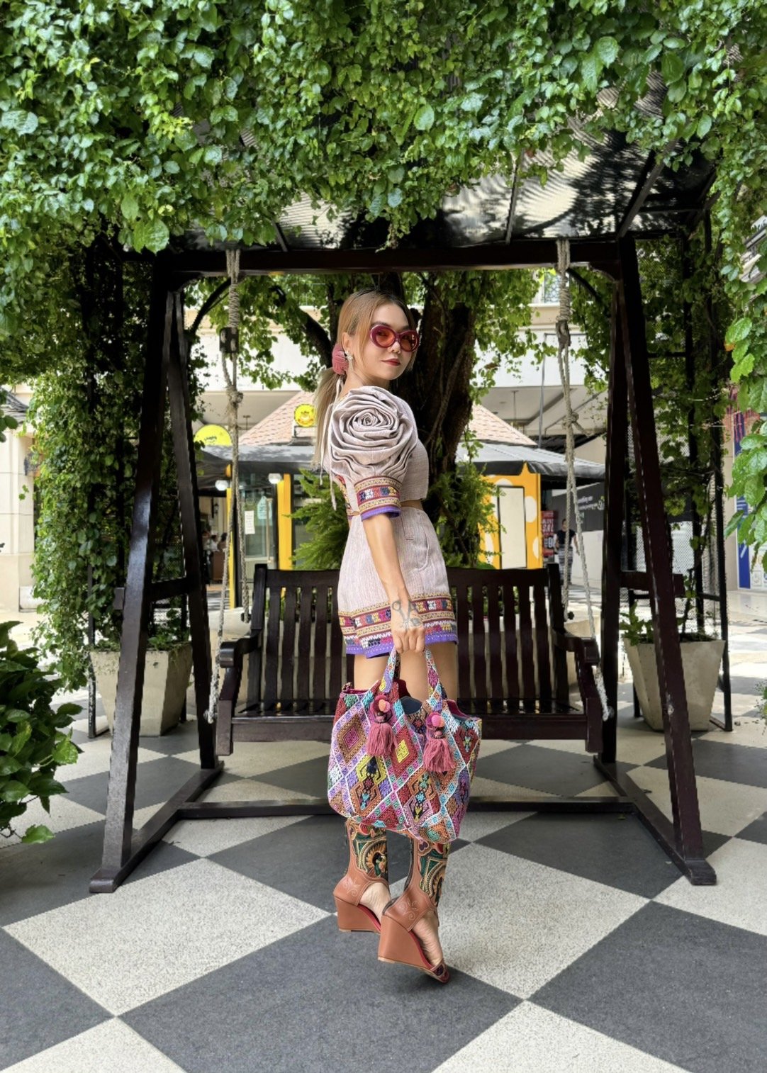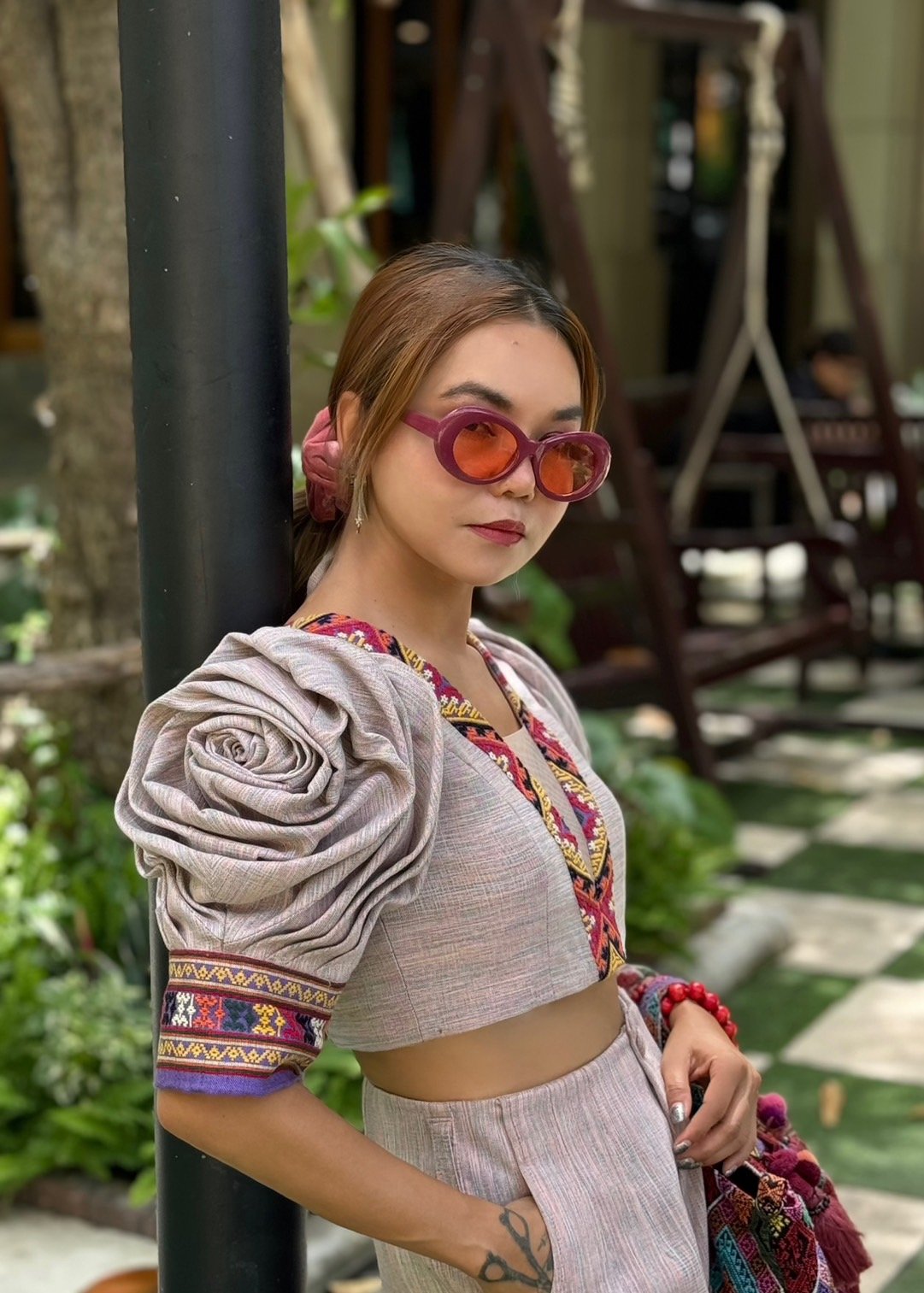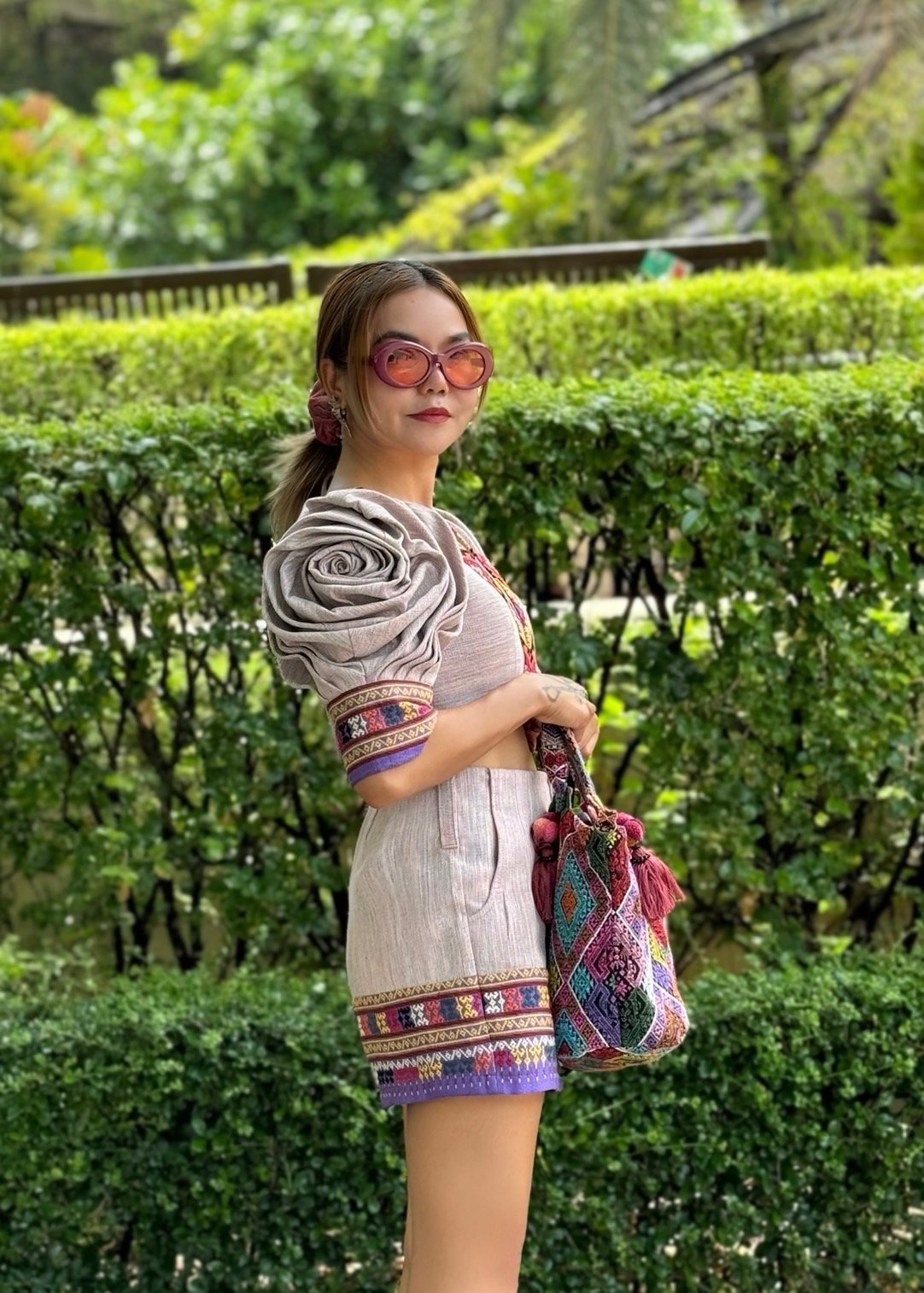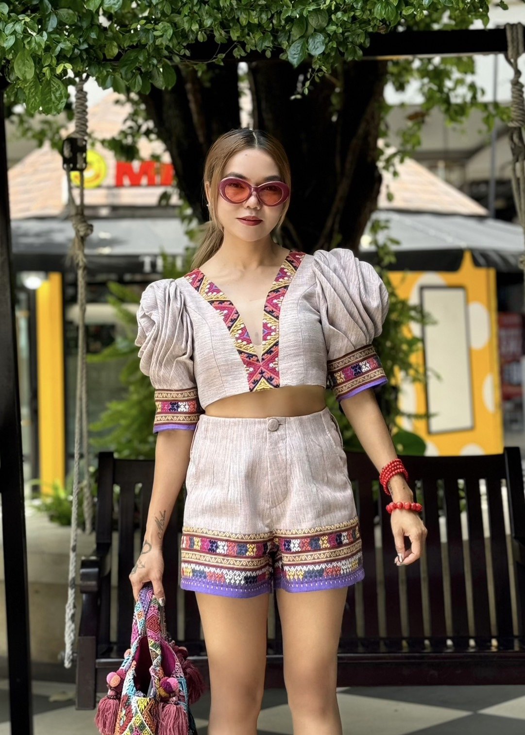 สื้อยืดคอจับจีบเฉียง มิกซ์แอนด์แมทช์ กับกางเกงจากผ้ามัดหมี่ ของดี จ.ลพบุรี